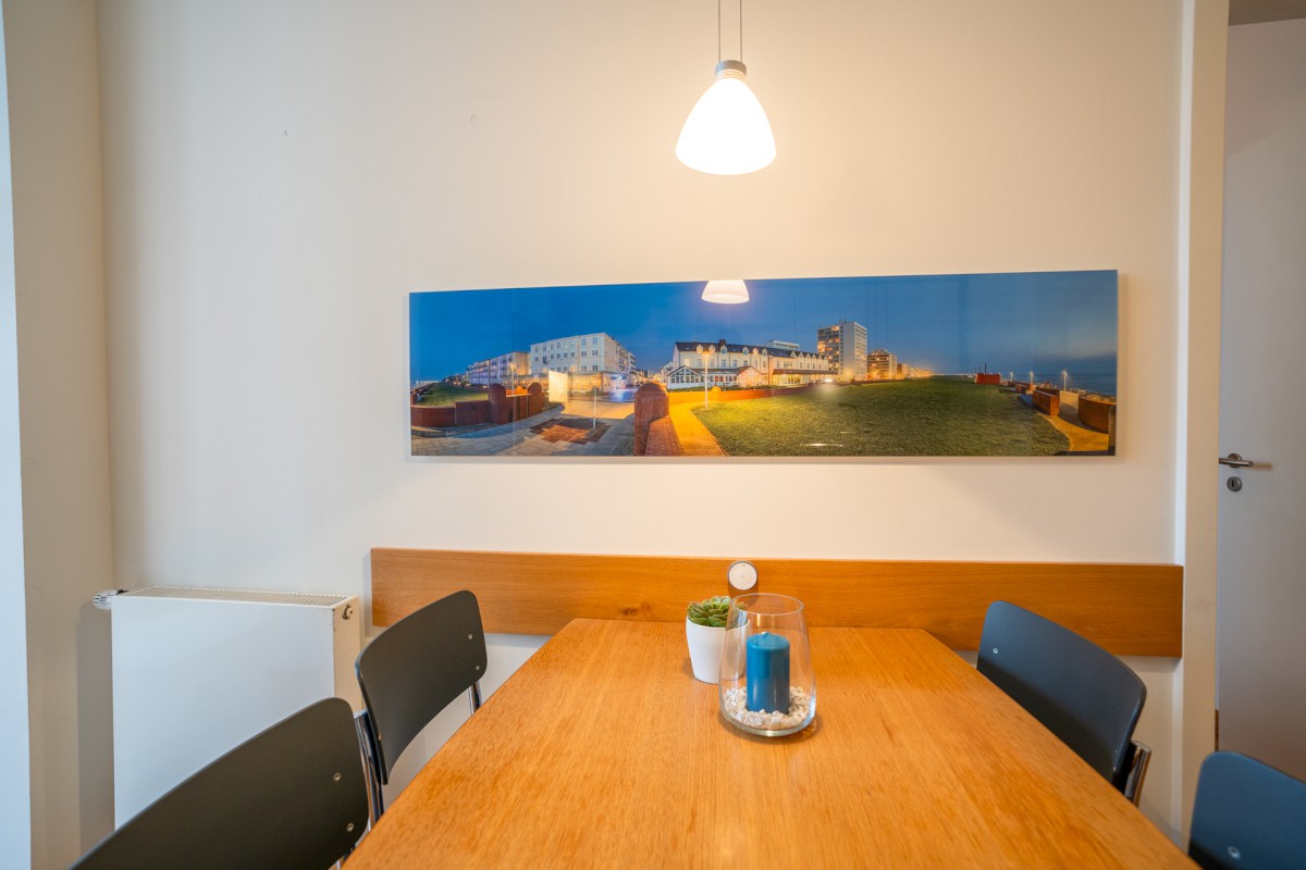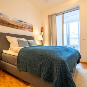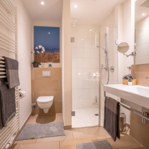 Hier sehen Sie den Grundriss der Ferienwohnung: Wohnzimmer, Schlafzimmer Eltern, Kinderzimmer, Badezimmer, Gäste WC, Loggia, Garderobe, großer Flur.